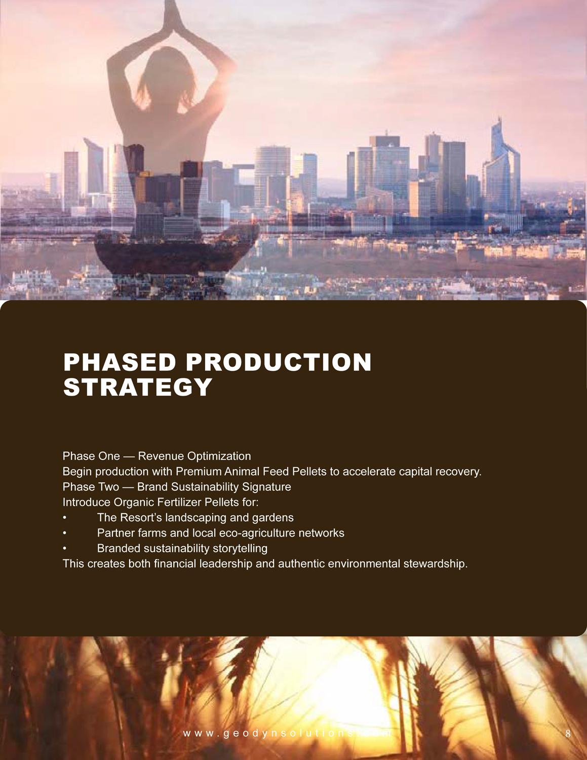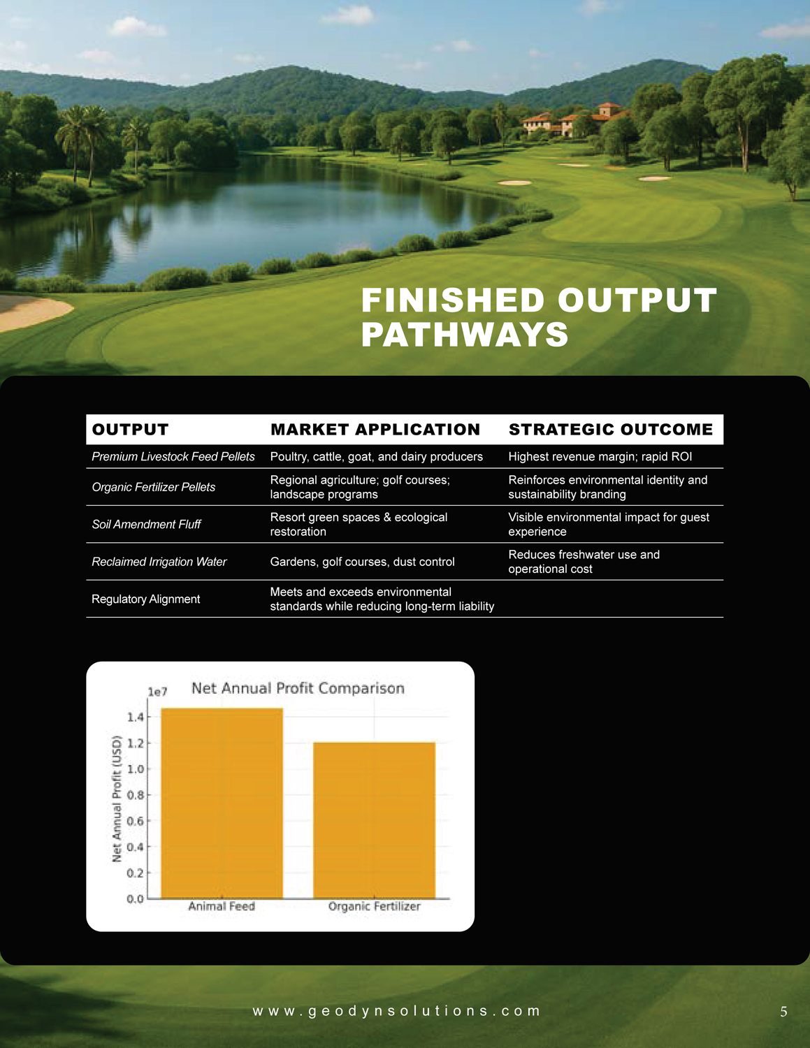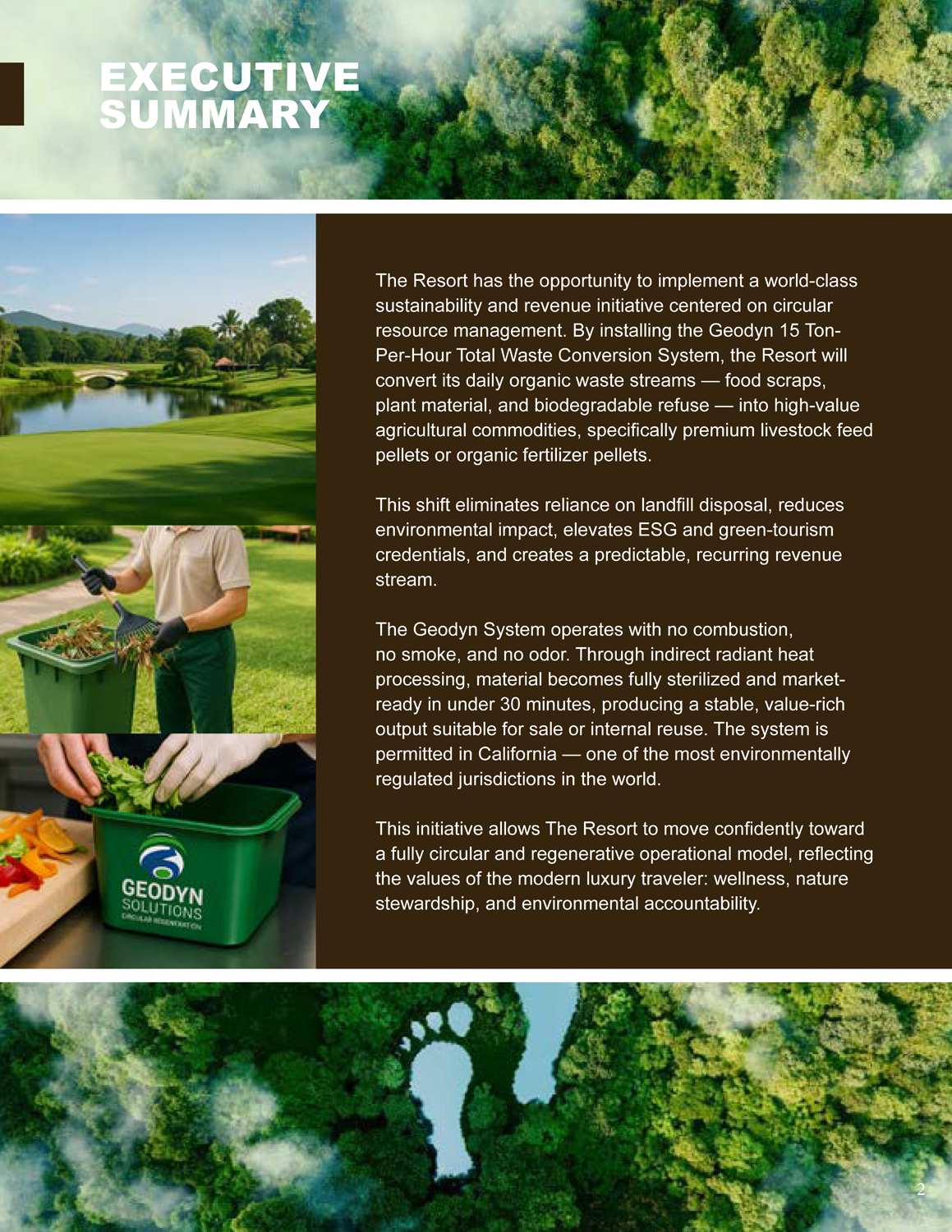 The Resort has the opportunity to implement a world-class sustainability and revenue initiative centered on circular resource management. By installing the Geodyn 15 Ton-Per-Hour Total Waste Conversion System, the Resort will convert its daily organic waste streams — food scraps, plant material, and biodegradable refuse — into high-value agricultural commodities, specifically premium livestock feed pellets or organic fertilizer pellets.