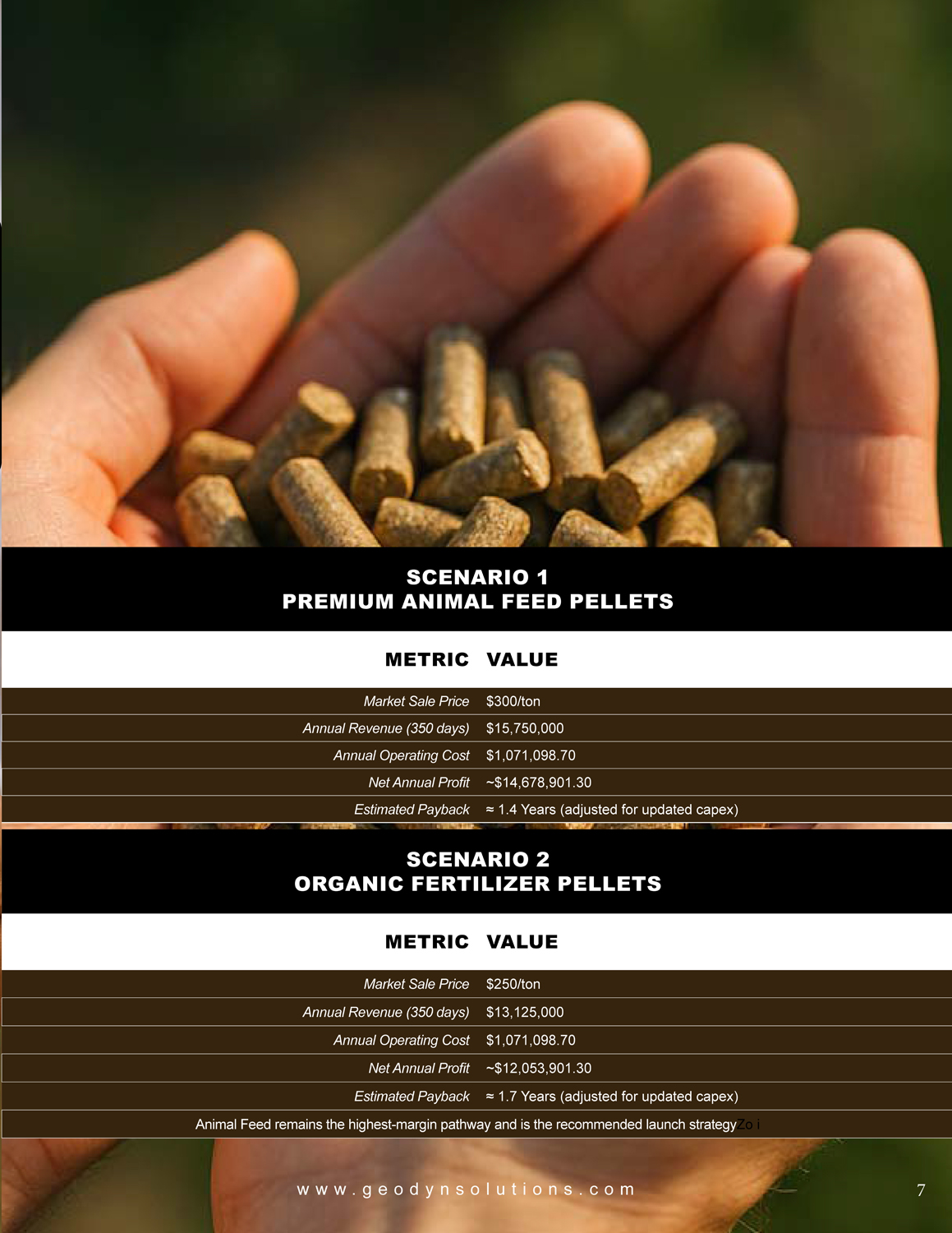 Begin production with Premium Animal Feed Pellets to accelerate capital recovery.