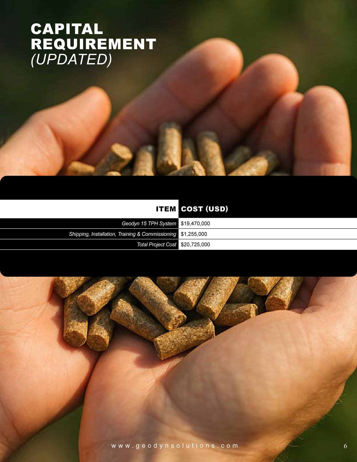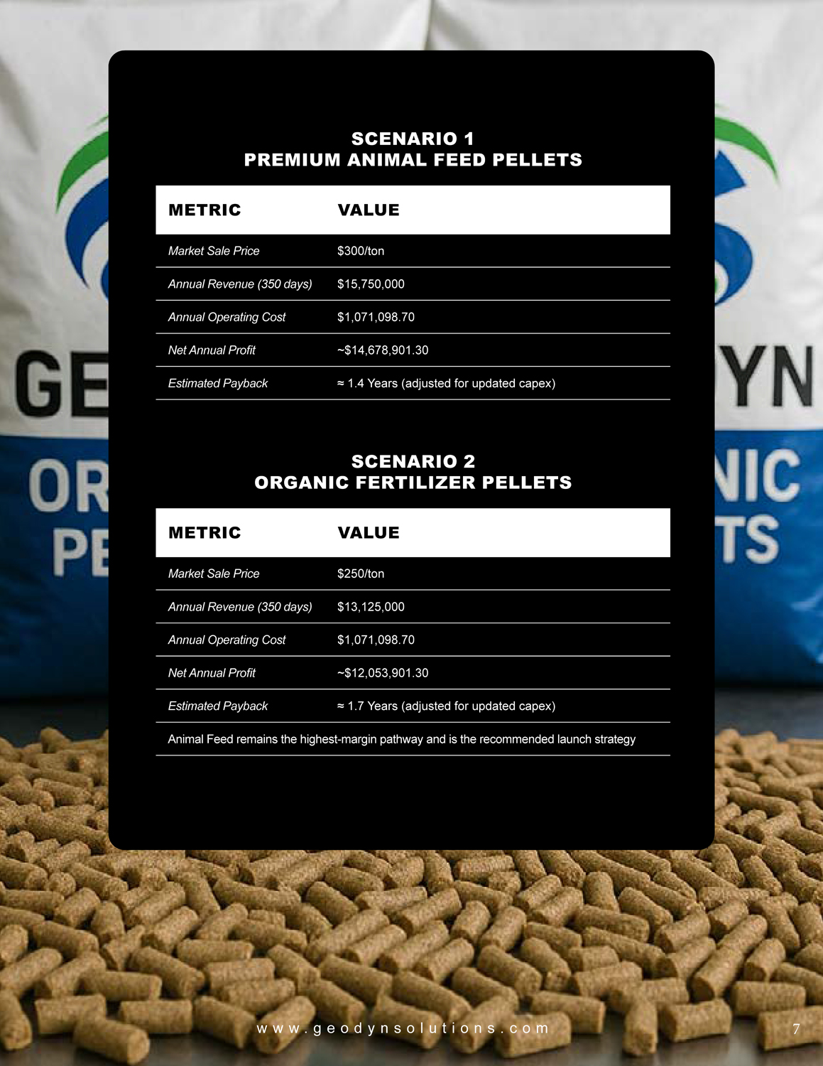 Begin production with Premium Animal Feed Pellets to accelerate capital recovery.