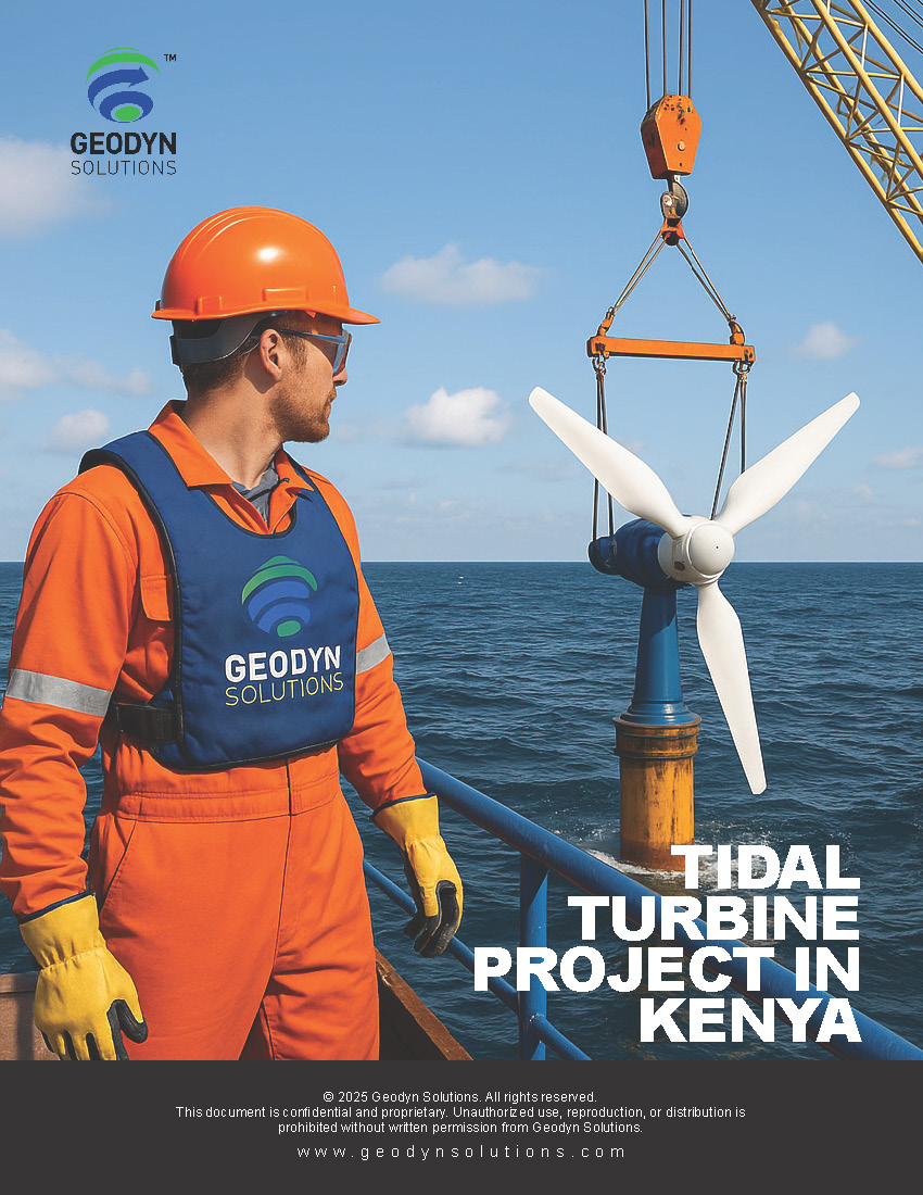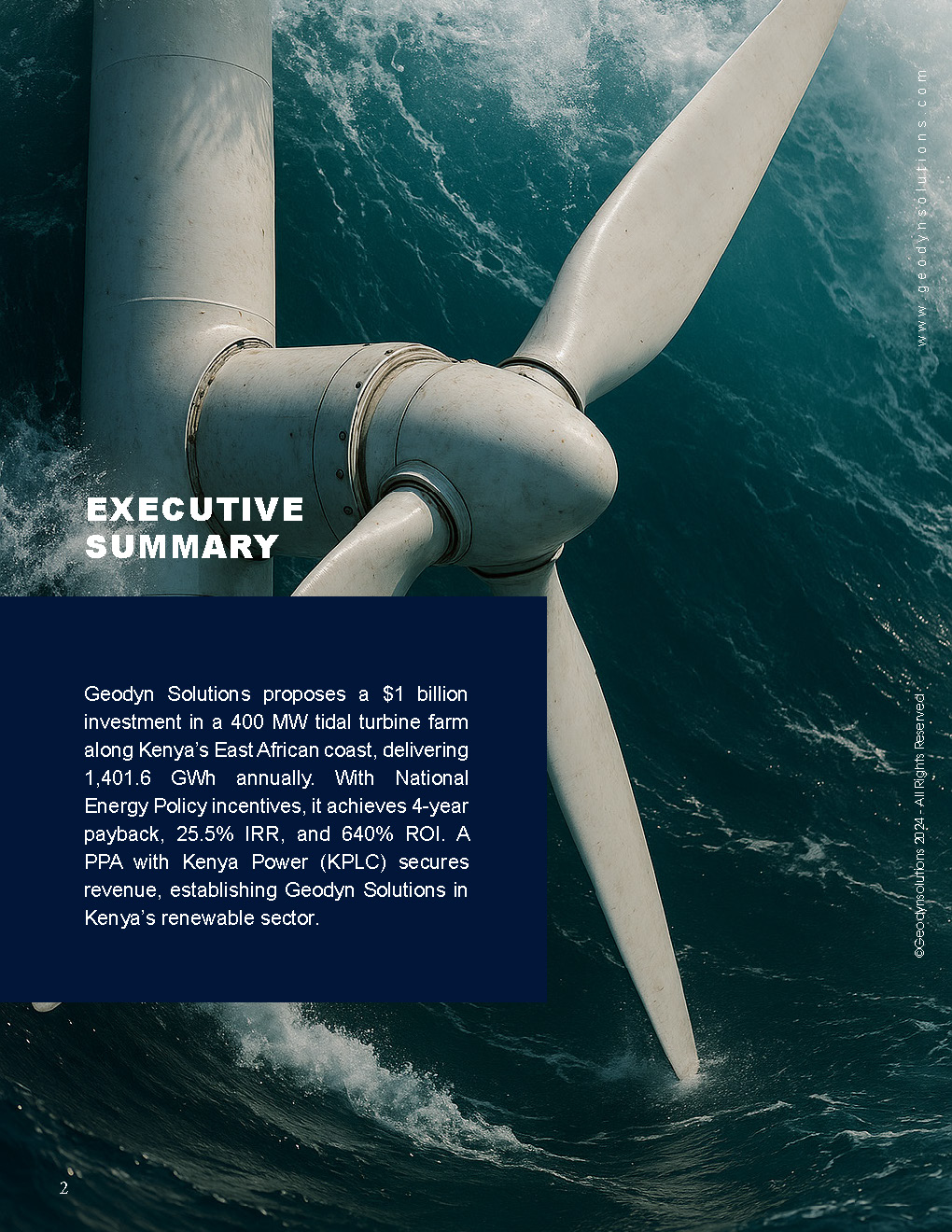 Geodyn Solutions proposes a $1 billion investment in a 400 MW tidal turbine farm along Kenya’s East African coast, delivering 1,401.6 GWh annually. With National Energy Policy incentives, it achieves 4-year payback, 25.5% IRR, and 640% ROI. A PPA with Kenya Power (KPLC) secures revenue, establishing Geodyn Solutions in Kenya’s renewable sector.