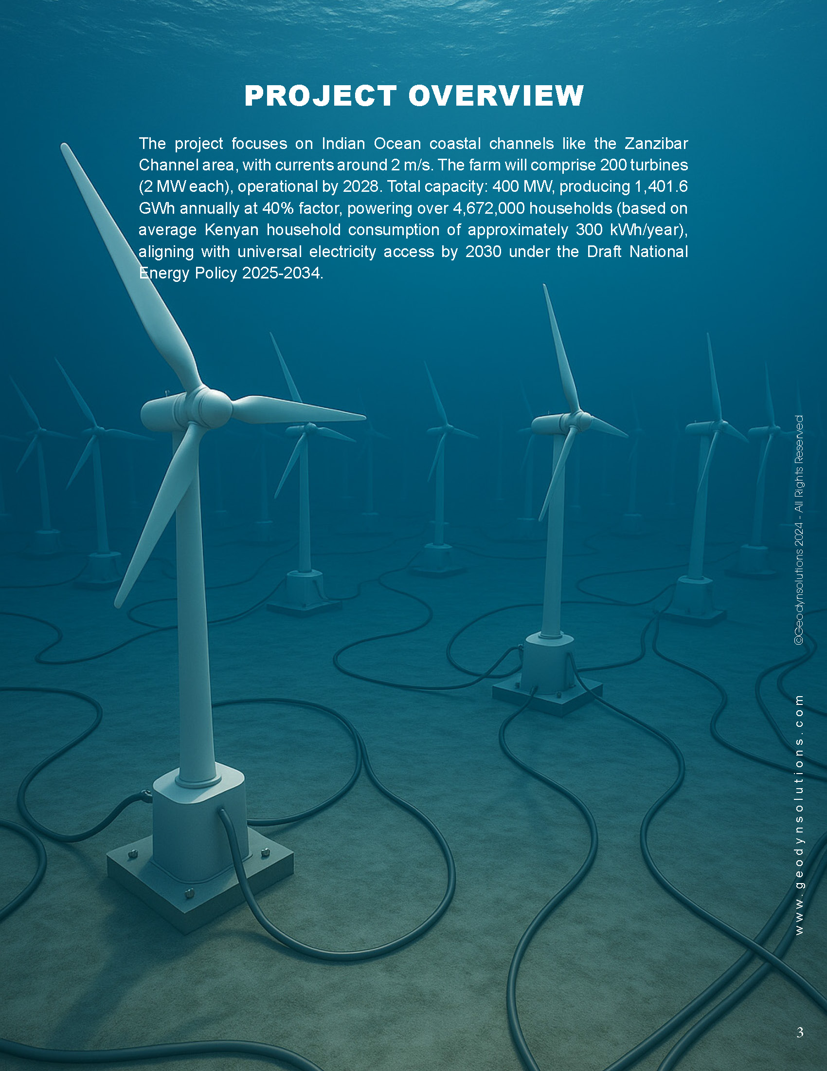 The project focuses on Indian Ocean coastal channels like the Zanzibar Channel area, with currents around 2 m/s. The farm will comprise 200 turbines (2 MW each), operational by 2028. Total capacity: 400 MW, producing 1,401.6 GWh annually at 40% factor, powering over 4,672,000 households (based on average Kenyan household consumption of approximately 300 kWh/year), aligning with universal electricity access by 2030 under the Draft National Energy Policy 2025-2034.