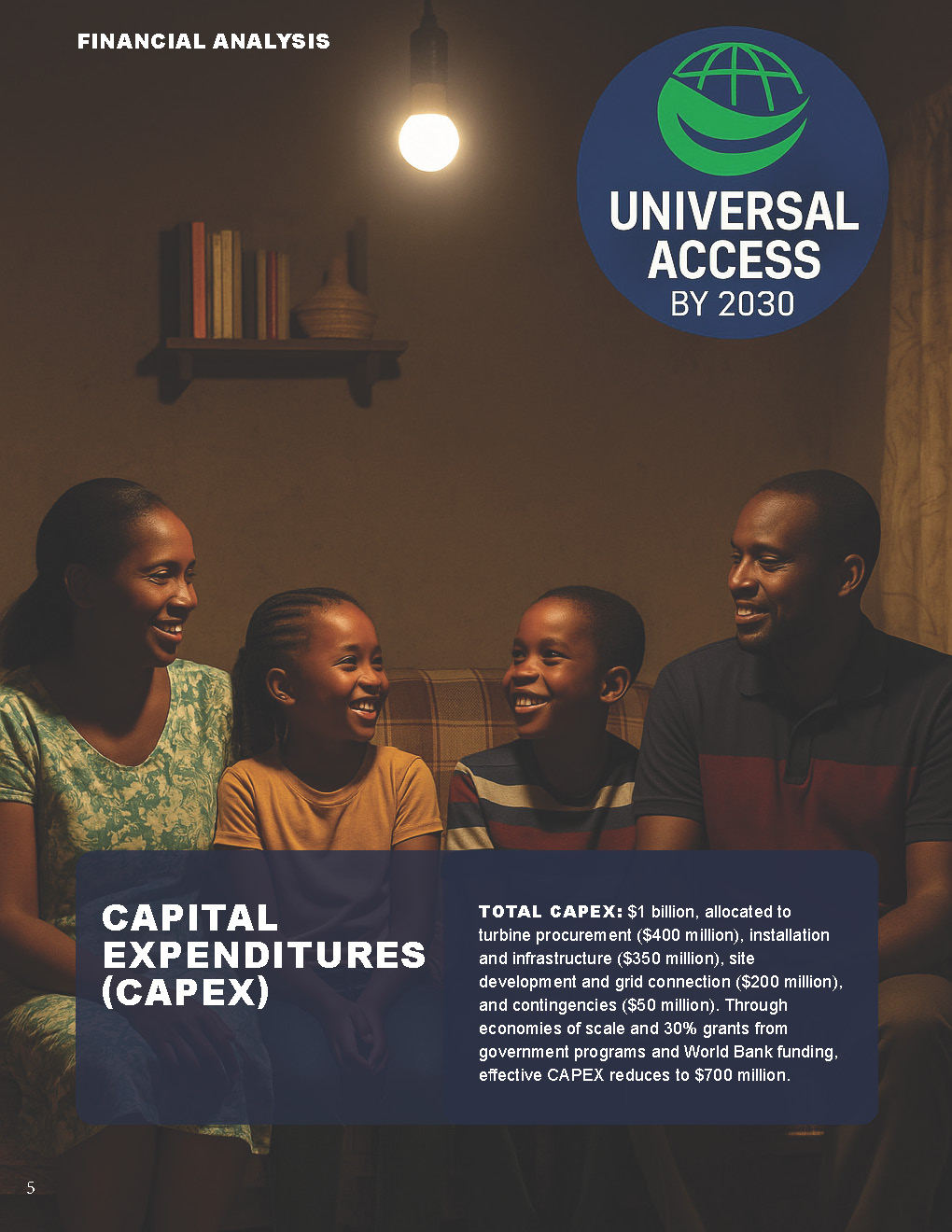 Total CAPEX: $1 billion, allocated to turbine procurement ($400 million), installation and infrastructure ($350 million), site development and grid connection ($200 million), and contingencies ($50 million). Through economies of scale and 30% grants from government programs and World Bank funding, effective CAPEX reduces to $700 million.