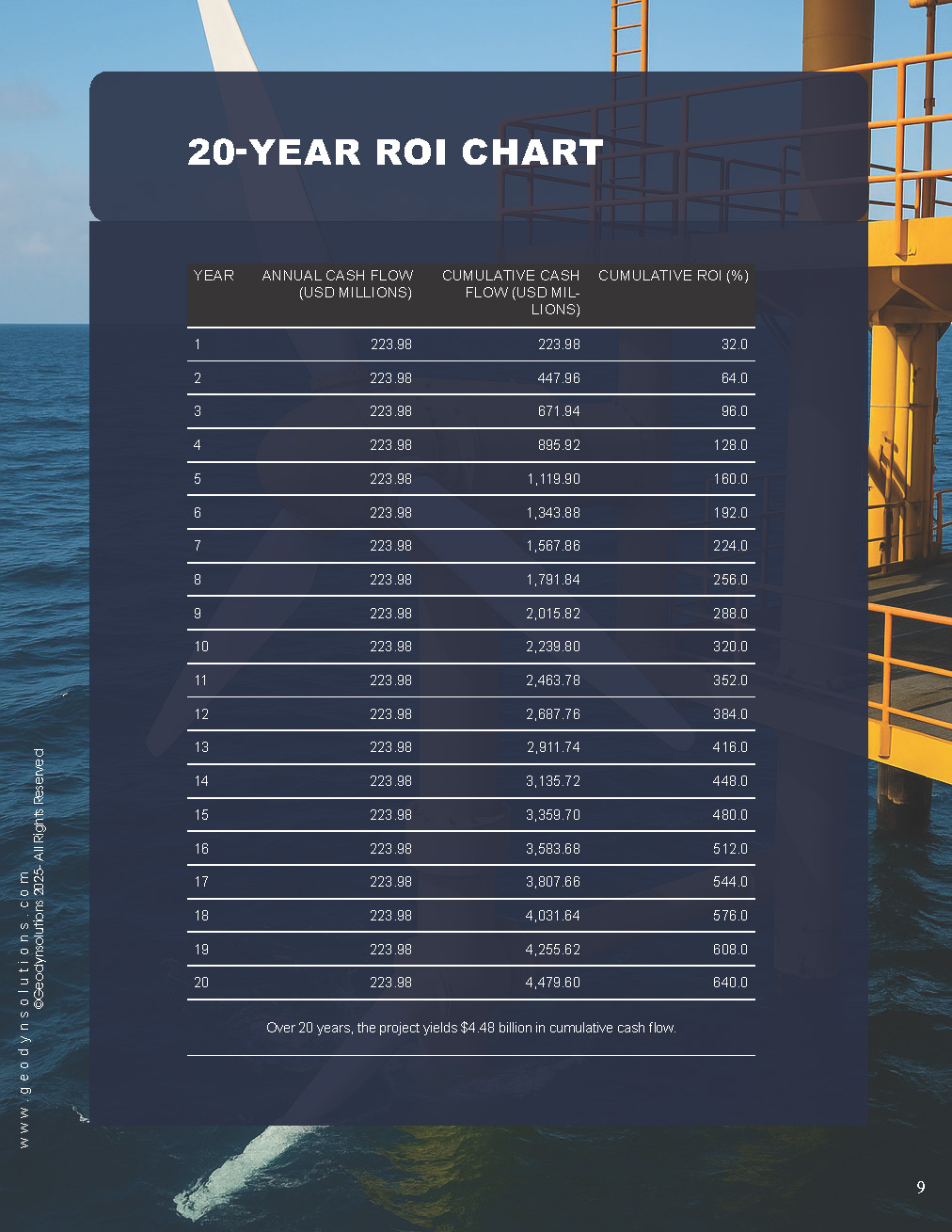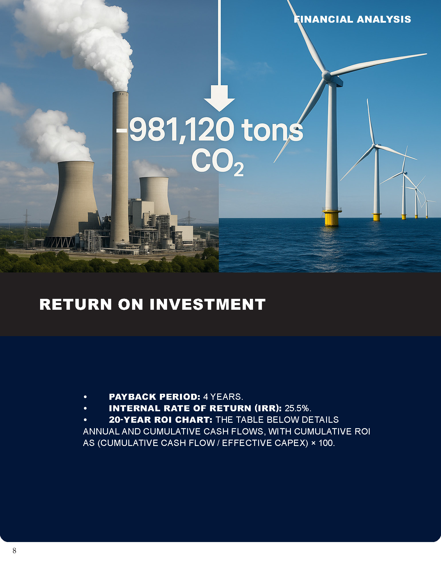• 20-Year ROI Chart: The table below details annual and cumulative cash flows, with cumulative ROI as (cumulative cash flow / effective CAPEX) × 100.