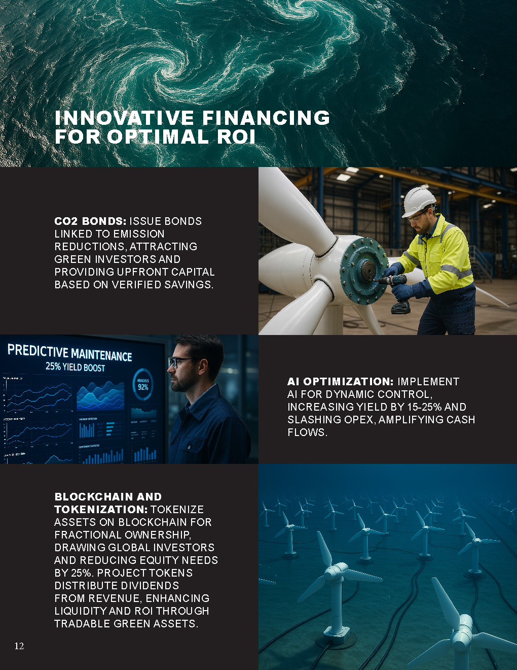 • Blockchain and Tokenization: Tokenize assets on blockchain for fractional ownership, drawing global investors and reducing equity needs by 25%. Project tokens distribute dividends from revenue, enhancing liquidity and ROI through tradable green assets.