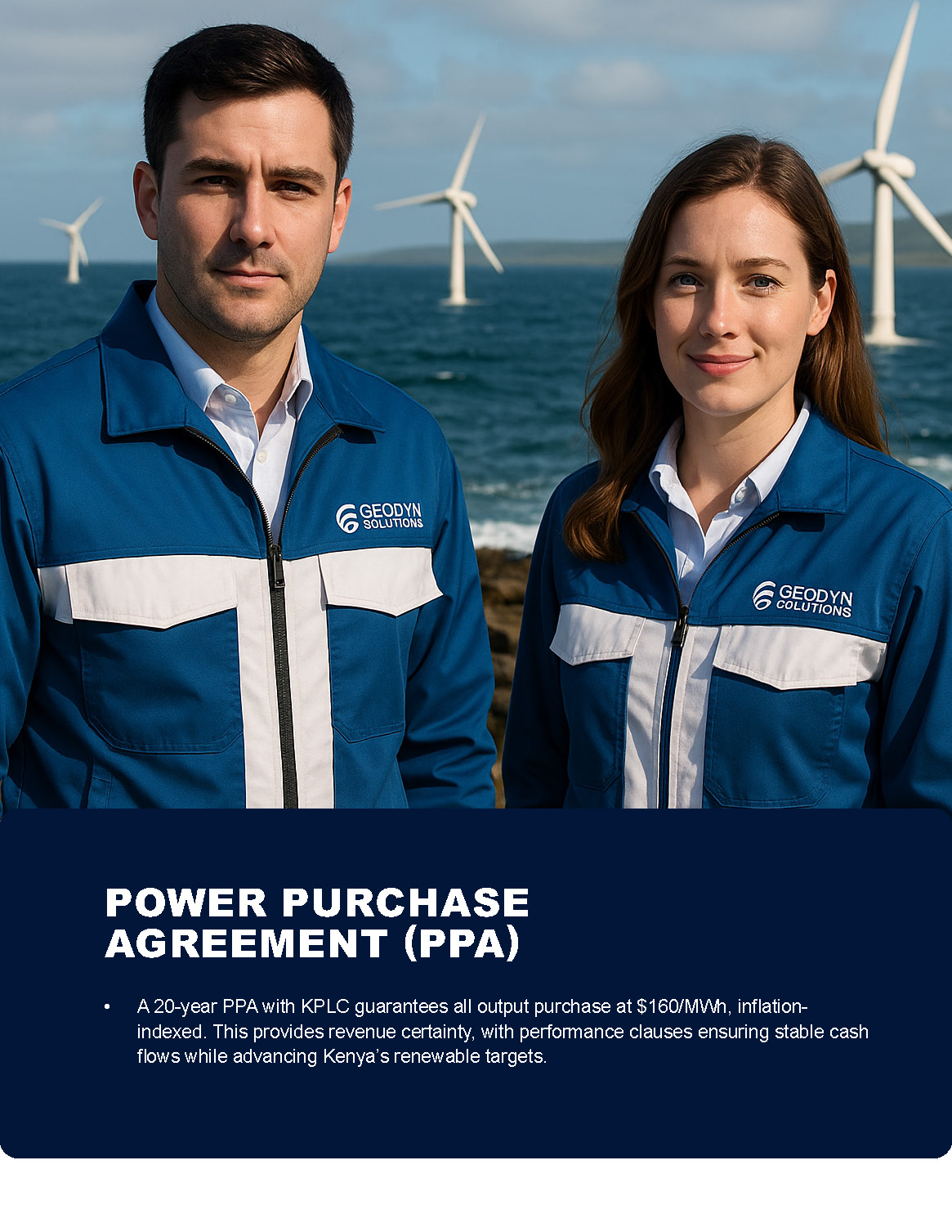 A 20-year PPA with KPLC guarantees all output purchase at $160/MWh, inflation-indexed. This provides revenue certainty, with performance clauses ensuring stable cash flows while advancing Kenya’s renewable targets.