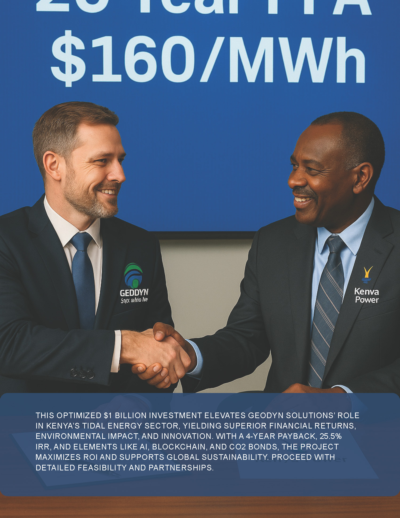 This optimized $1 billion investment elevates Geodyn Solutions’ role in Kenya’s tidal energy sector, yielding superior financial returns, environmental impact, and innovation. With a 4-year payback, 25.5% IRR, and elements like AI, blockchain, and CO2 bonds, the project maximizes ROI and supports global sustainability. Proceed with detailed feasibility and partnerships.
