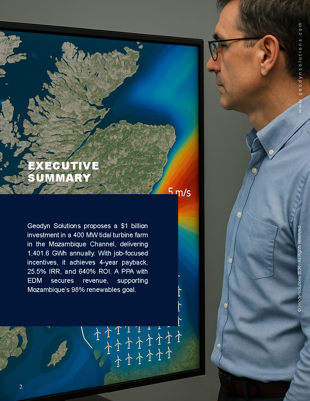 Geodyn Solutions proposes a $1 billion investment in a 400 MW tidal turbine farm in the Mozambique Channel, delivering 1,401.6 GWh annually. With job-focused incentives, it achieves 4-year payback, 25.5% IRR, and 640% ROI. A PPA with EDM secures revenue, supporting Mozambique’s 98% renewables goal.