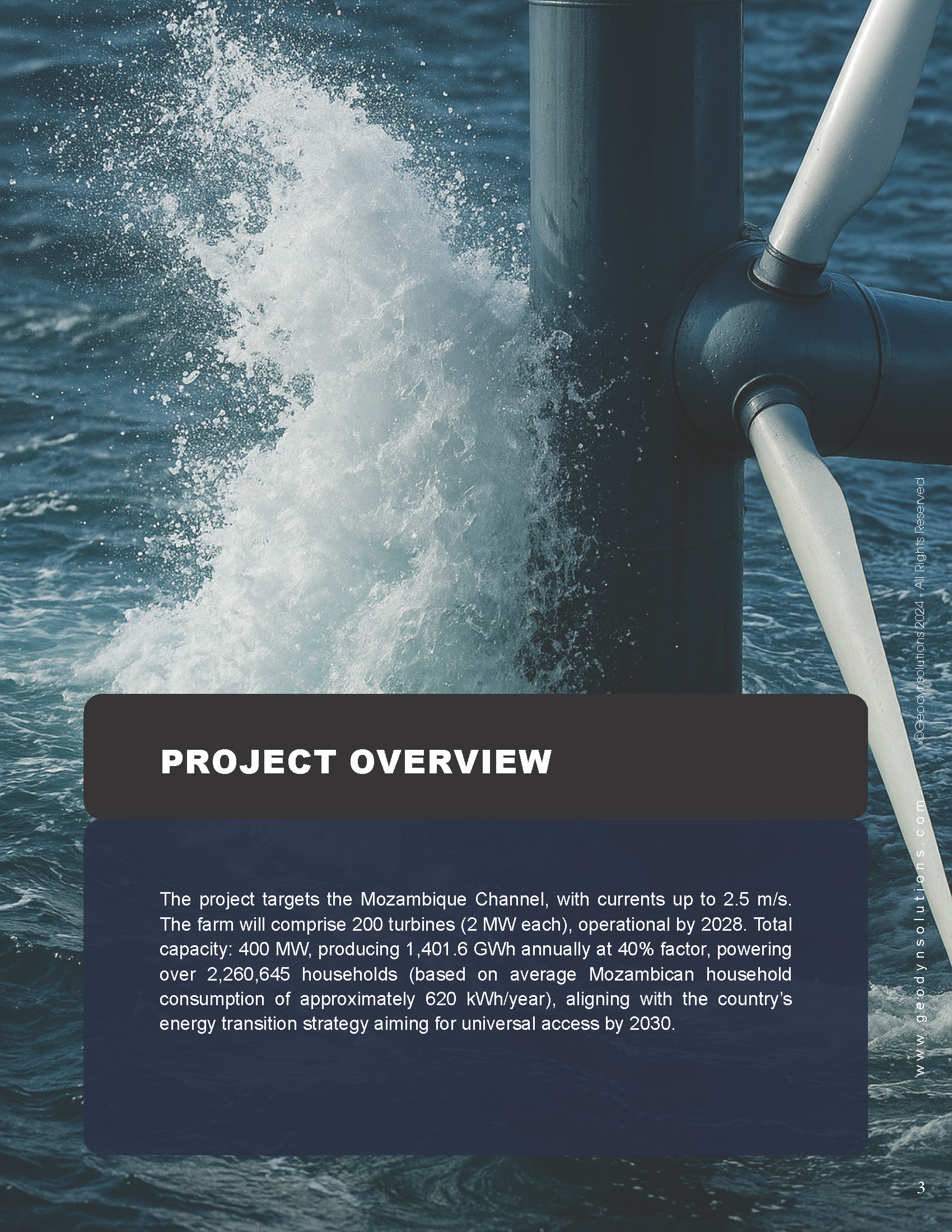 The project targets the Mozambique Channel, with currents up to 2.5 m/s. The farm will comprise 200 turbines (2 MW each), operational by 2028. Total capacity: 400 MW, producing 1,401.6 GWh annually at 40% factor, powering over 2,260,645 households (based on average Mozambican household consumption of approximately 620 kWh/year), aligning with the country’s energy transition strategy aiming for universal access by 2030.
