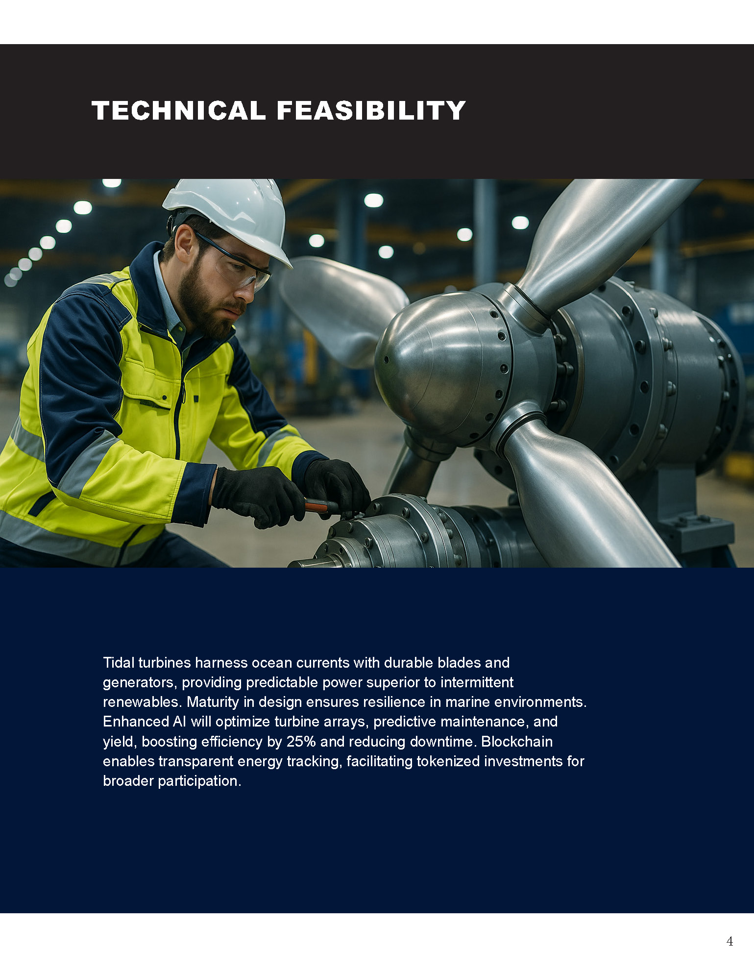 Tidal turbines harness ocean currents with durable blades and generators, providing predictable power superior to intermittent renewables. Maturity in design ensures resilience in marine environments. Enhanced AI will optimize turbine arrays, predictive maintenance, and yield, boosting efficiency by 25% and reducing downtime. Blockchain enables transparent energy tracking, facilitating tokenized investments for broader participation.