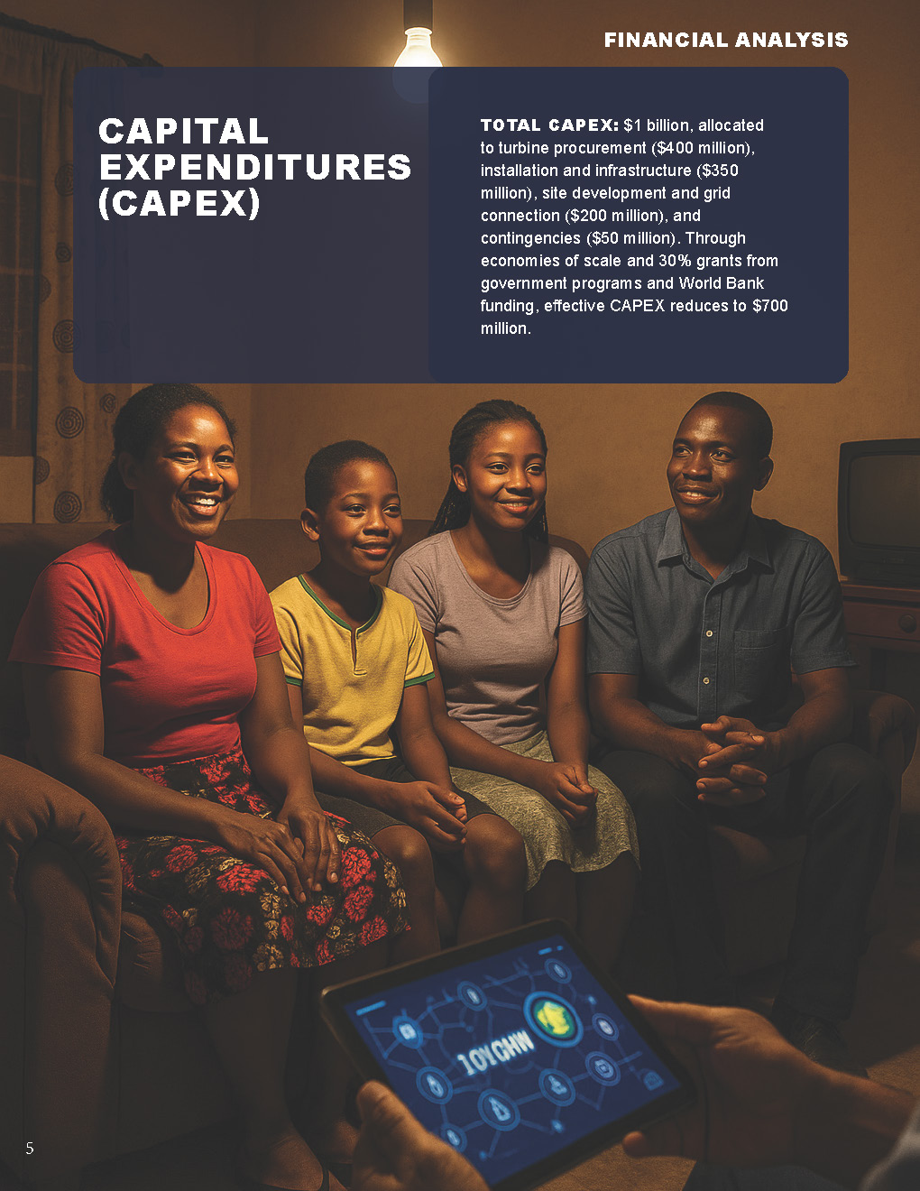 Total CAPEX: $1 billion, allocated to turbine procurement ($400 million), installation and infrastructure ($350 million), site development and grid connection ($200 million), and contingencies ($50 million). Through economies of scale and 30% grants from government programs and World Bank funding, effective CAPEX reduces to $700 million.