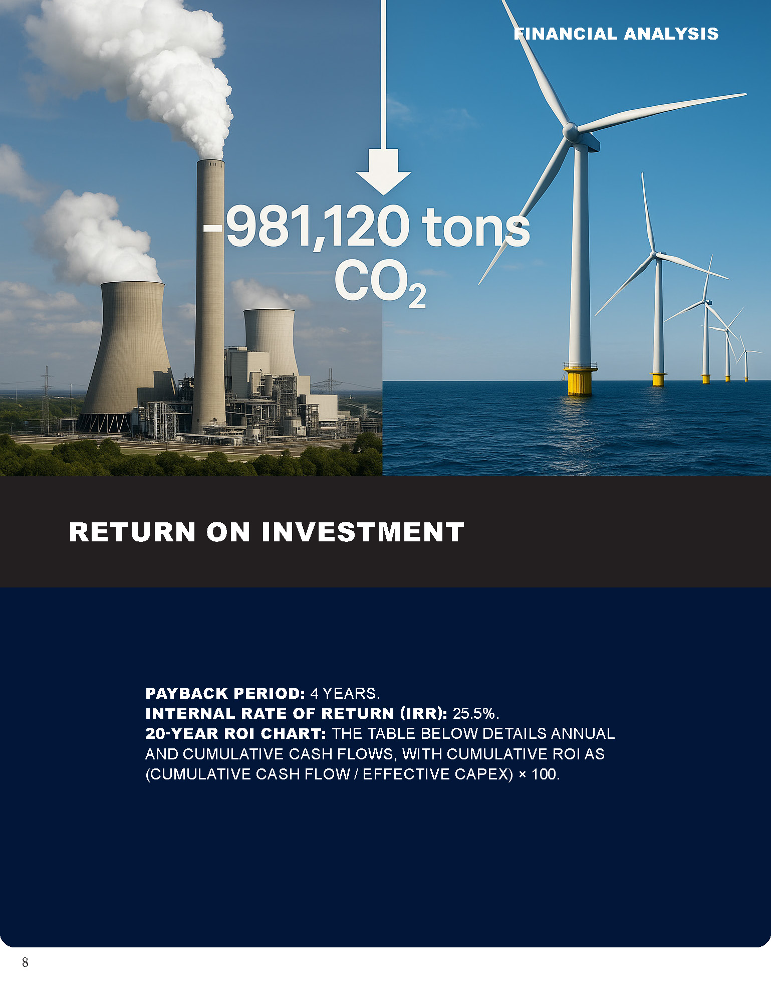 - 20-Year ROI Chart: The table below details annual and cumulative cash flows, with cumulative ROI as (cumulative cash flow / effective CAPEX) × 100.