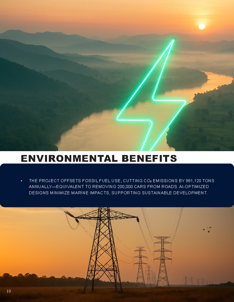 The project offsets fossil fuel use, cutting CO2 emissions by 981,120 tons annually—equivalent to removing 200,000 cars from roads. AI-optimized designs minimize marine impacts, supporting sustainable development.