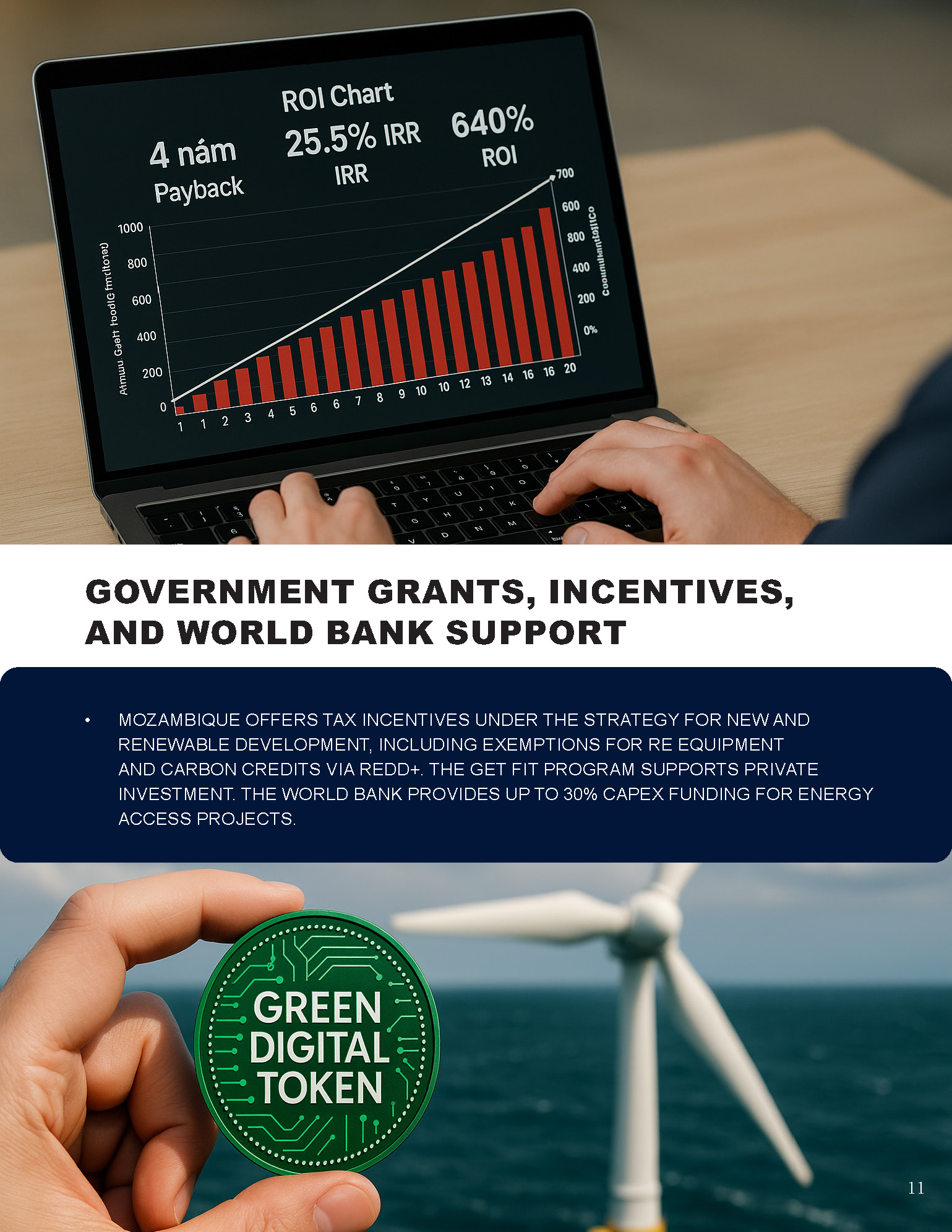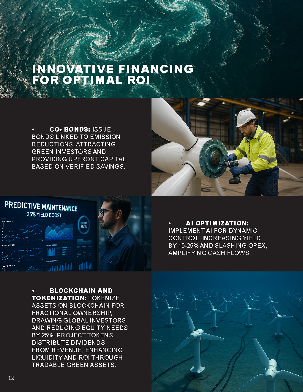 - Blockchain and Tokenization: Tokenize assets on blockchain for fractional ownership, drawing global investors and reducing equity needs by 25%. Project tokens distribute dividends from revenue, enhancing liquidity and ROI through tradable green assets.