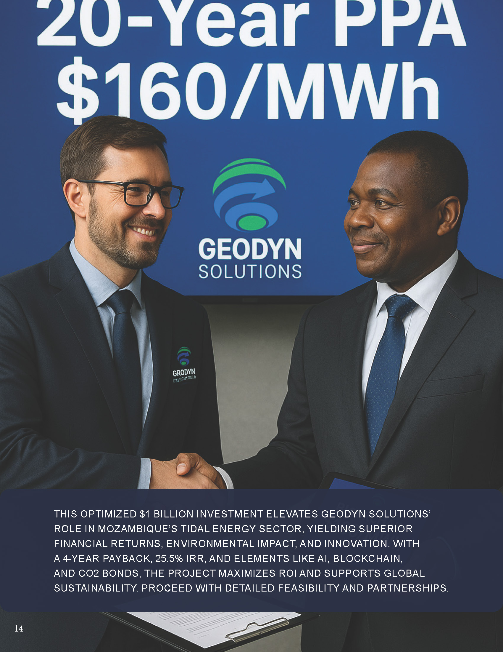 This optimized $1 billion investment elevates Geodyn Solutions’ role in Mozambique’s tidal energy sector, yielding superior financial returns, environmental impact, and innovation. With a 4-year payback, 25.5% IRR, and elements like AI, blockchain, and CO2 bonds, the project maximizes ROI and supports global sustainability. Proceed with detailed feasibility and partnerships.