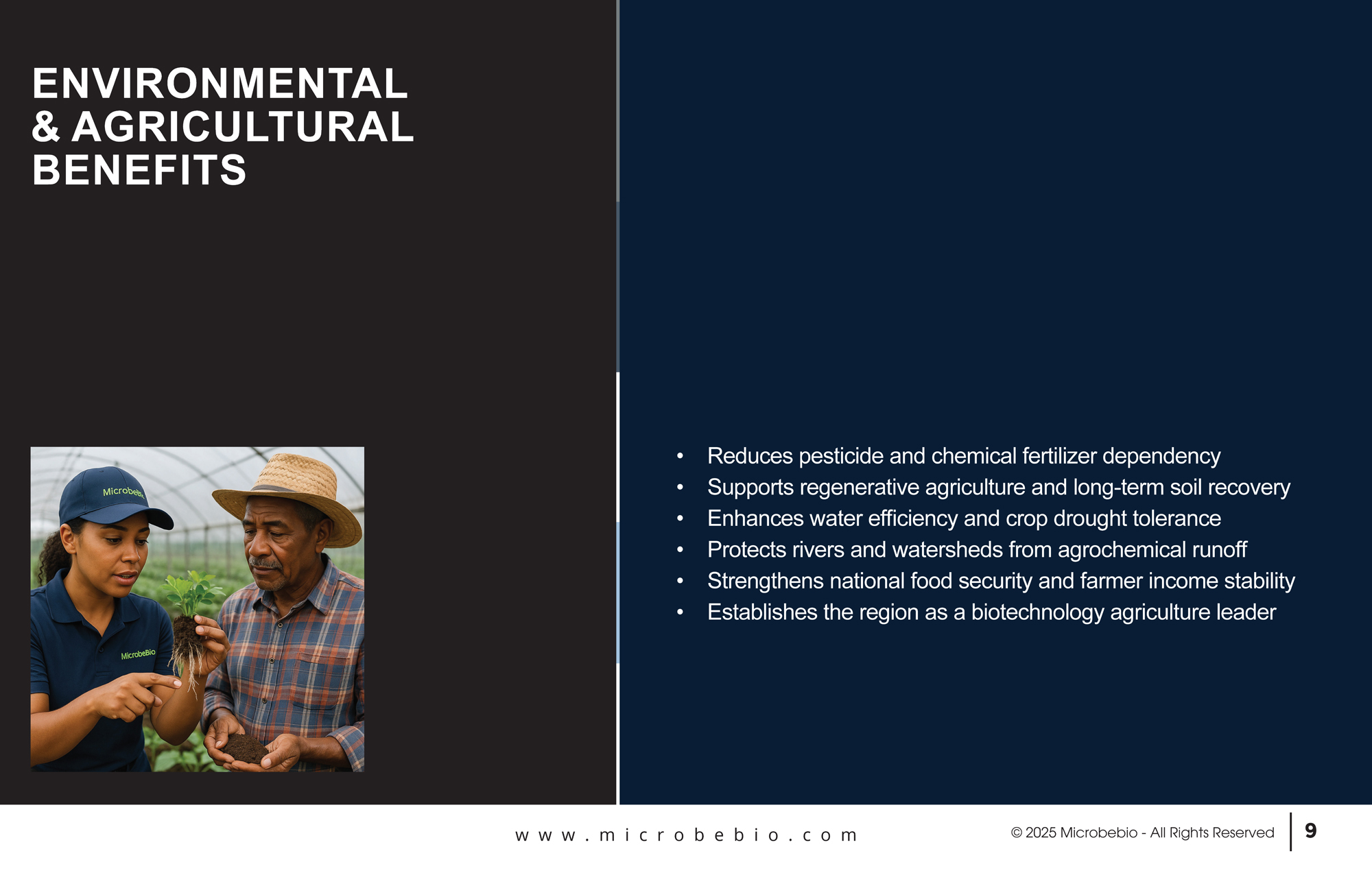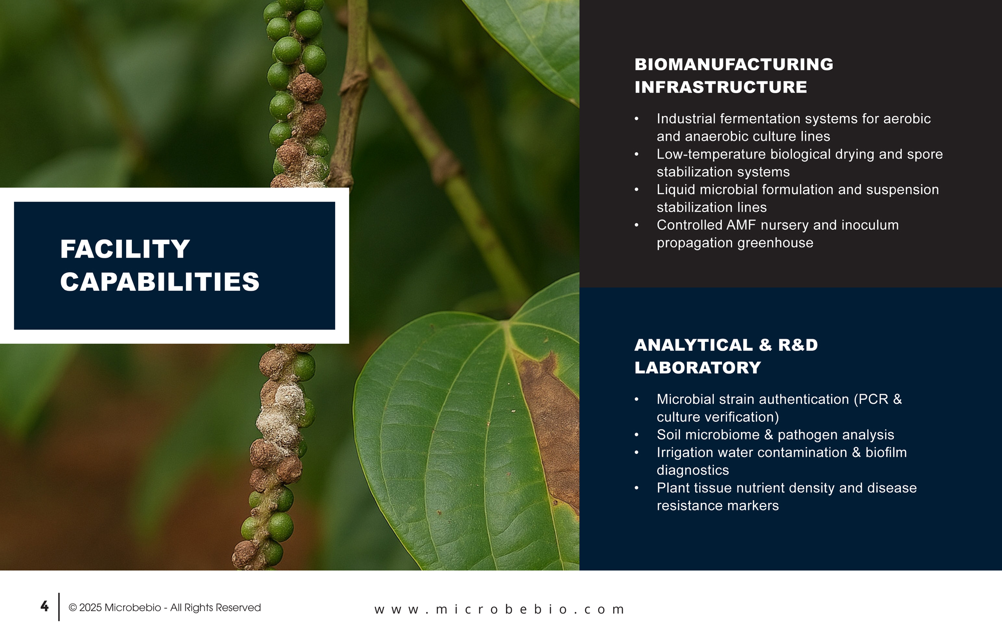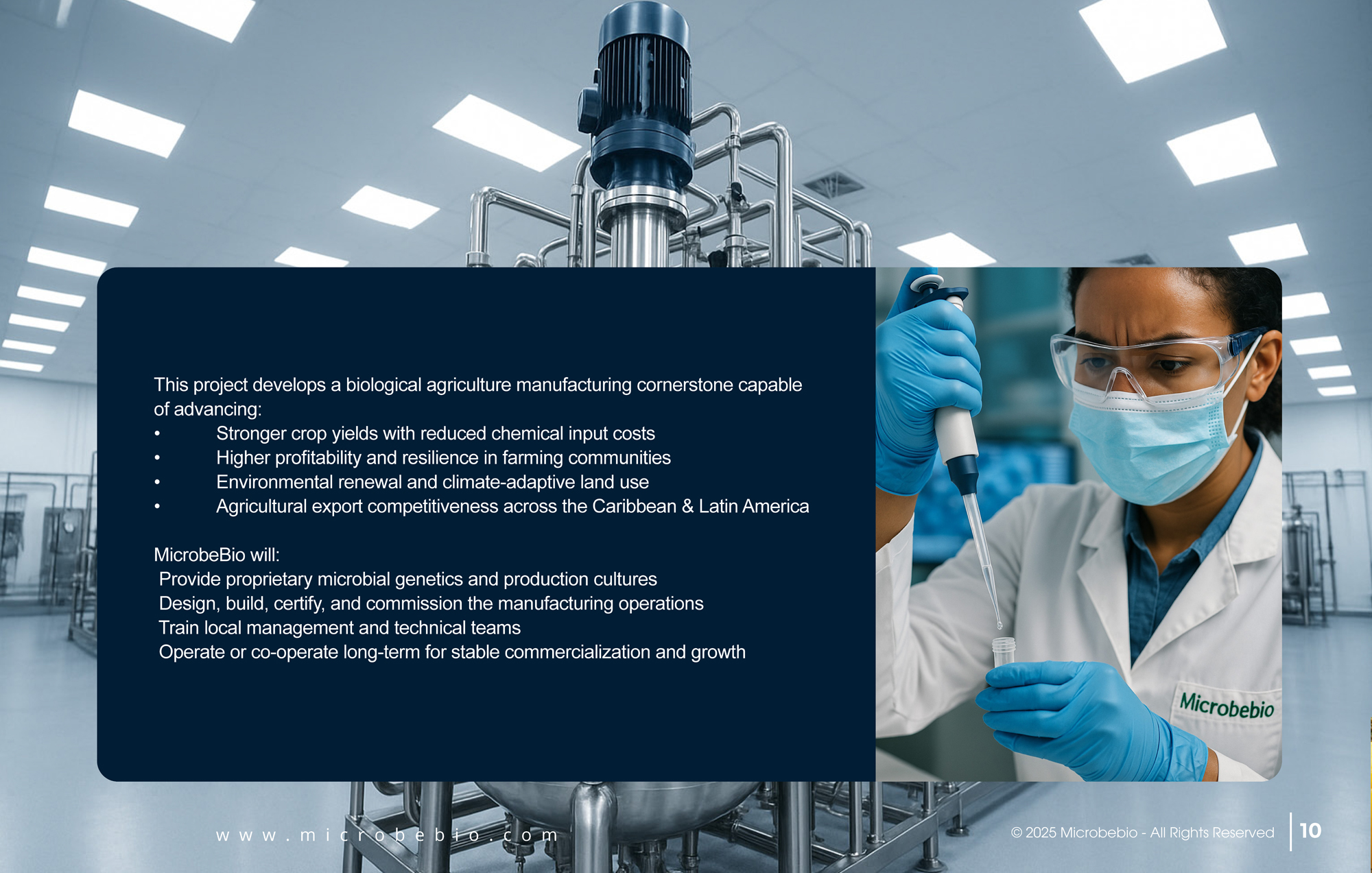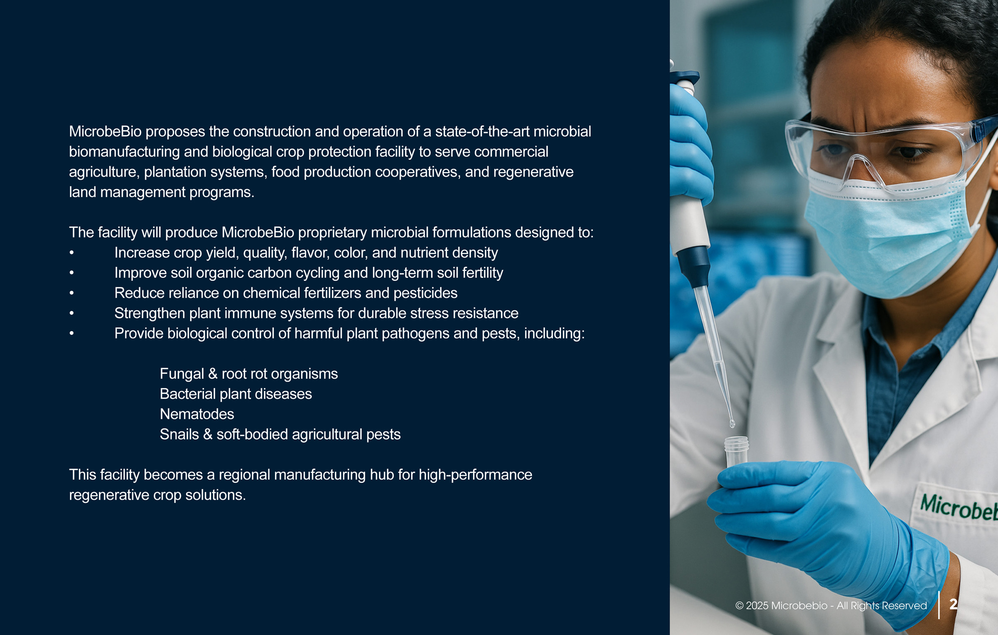 MicrobeBio proposes the construction and operation of a state-of-the-art microbial biomanufacturing and biological crop protection facility to serve commercial agriculture, plantation systems, food production cooperatives, and regenerative land management programs.