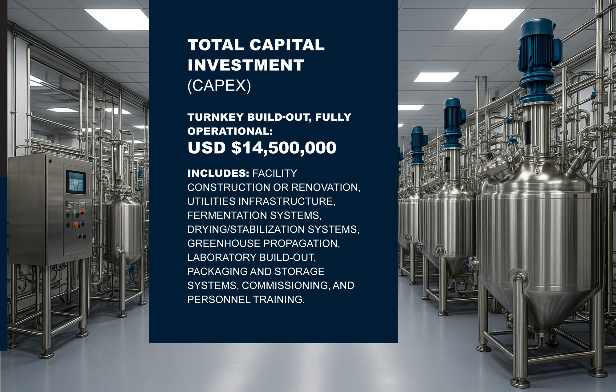 Includes: facility construction or renovation, utilities infrastructure, fermentation systems, drying/stabilization systems, greenhouse propagation, laboratory build-out, packaging and storage systems, commissioning, and personnel training.