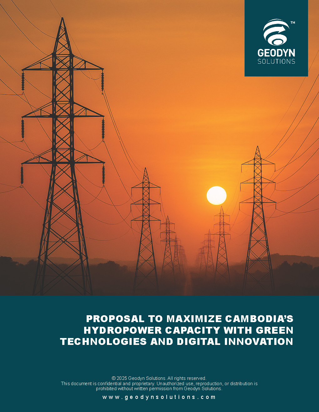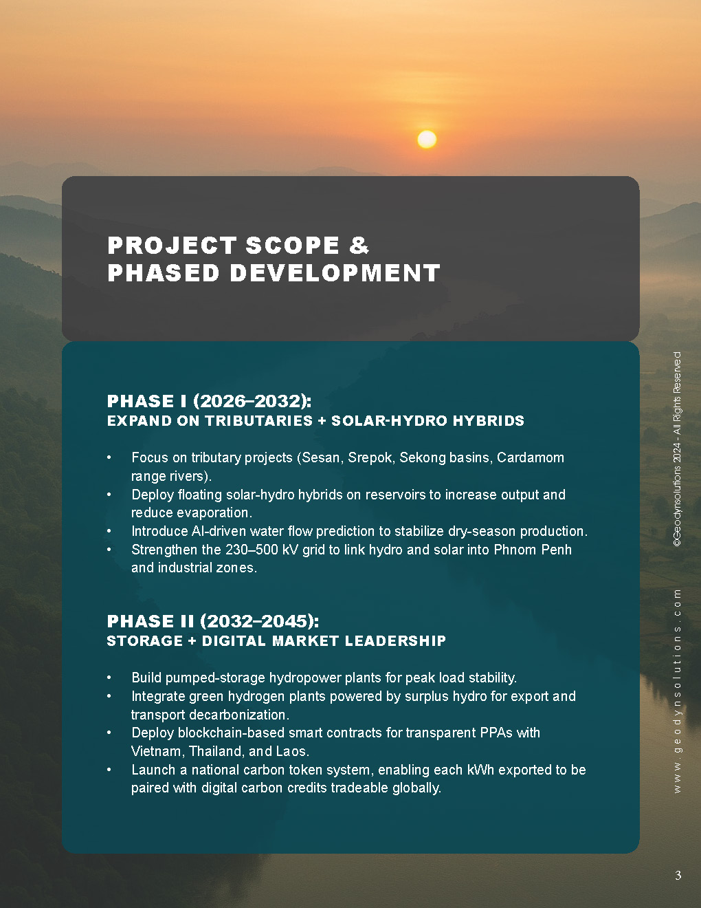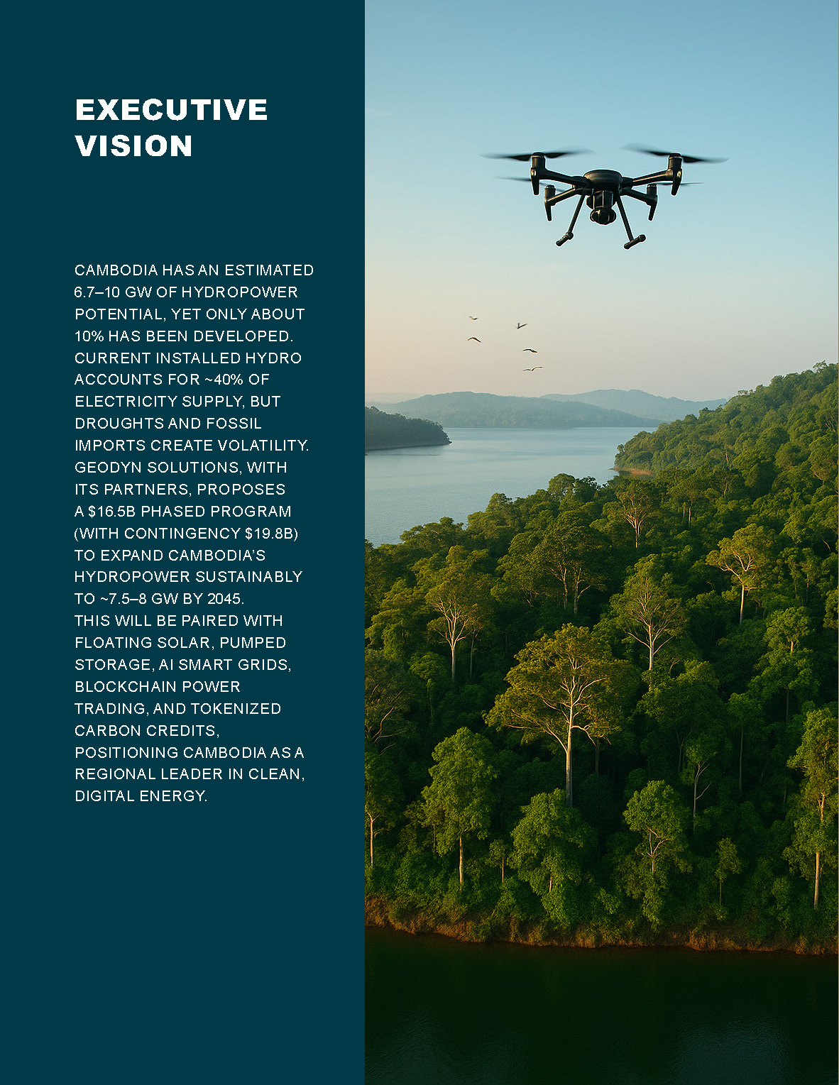 Cambodia has an estimated 6.7–10 GW of hydropower potential, yet only about 10% has been developed. Current installed hydro accounts for ~40% of electricity supply, but droughts and fossil imports create volatility. Geodyn Solutions, with its partners, proposes a $16.5B phased program (with contingency $19.8B) to expand Cambodia’s hydropower sustainably to ~7.5–8 GW by 2045. This will be paired with floating solar, pumped storage, AI smart grids, blockchain power trading, and tokenized carbon credits, positioning Cambodia as a regional leader in clean, digital energy.