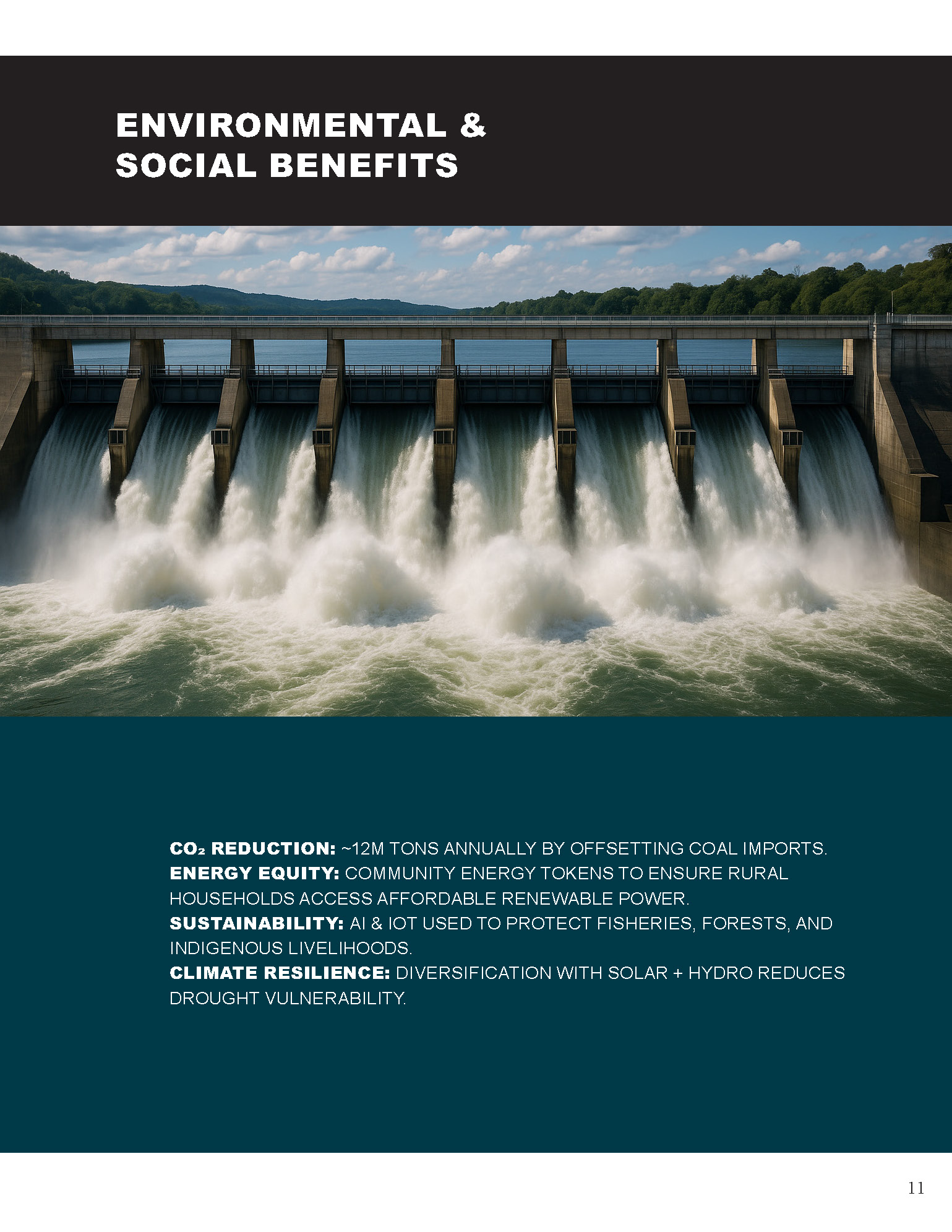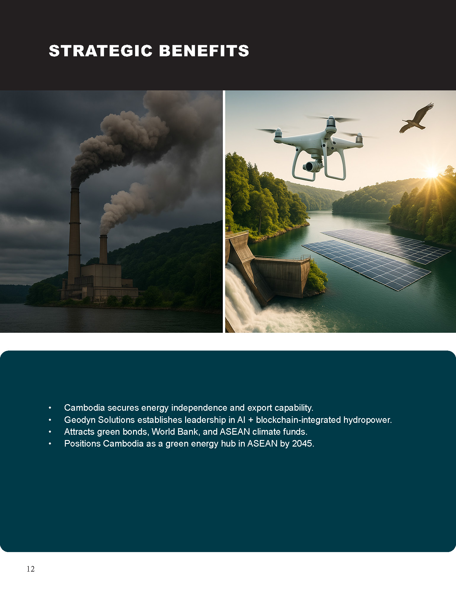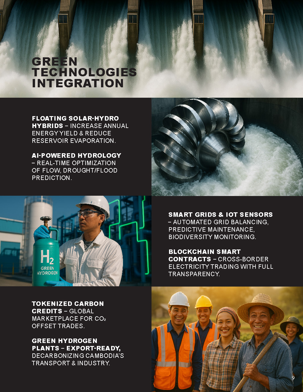 Cambodia has an estimated 6.7–10 GW of hydropower potential, yet only about 10% has been developed. Current installed hydro accounts for ~40% of electricity supply, but droughts and fossil imports create volatility. Geodyn Solutions, with its partners, proposes a $16.5B phased program (with contingency $19.8B) to expand Cambodia’s hydropower sustainably to ~7.5–8 GW by 2045. This will be paired with floating solar, pumped storage, AI smart grids, blockchain power trading, and tokenized carbon credits, positioning Cambodia as a regional leader in clean, digital energy.