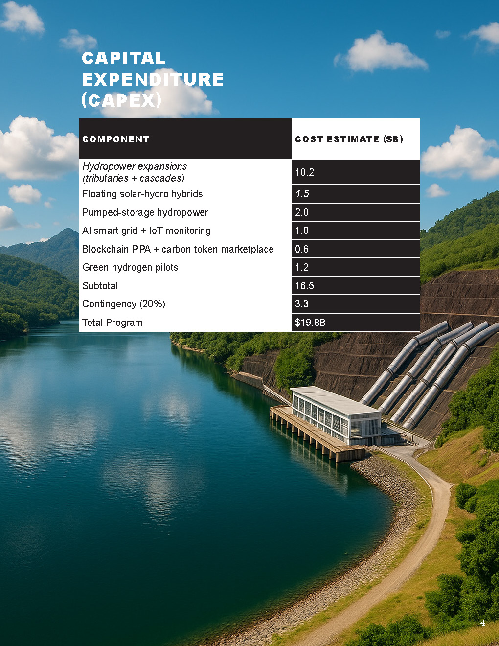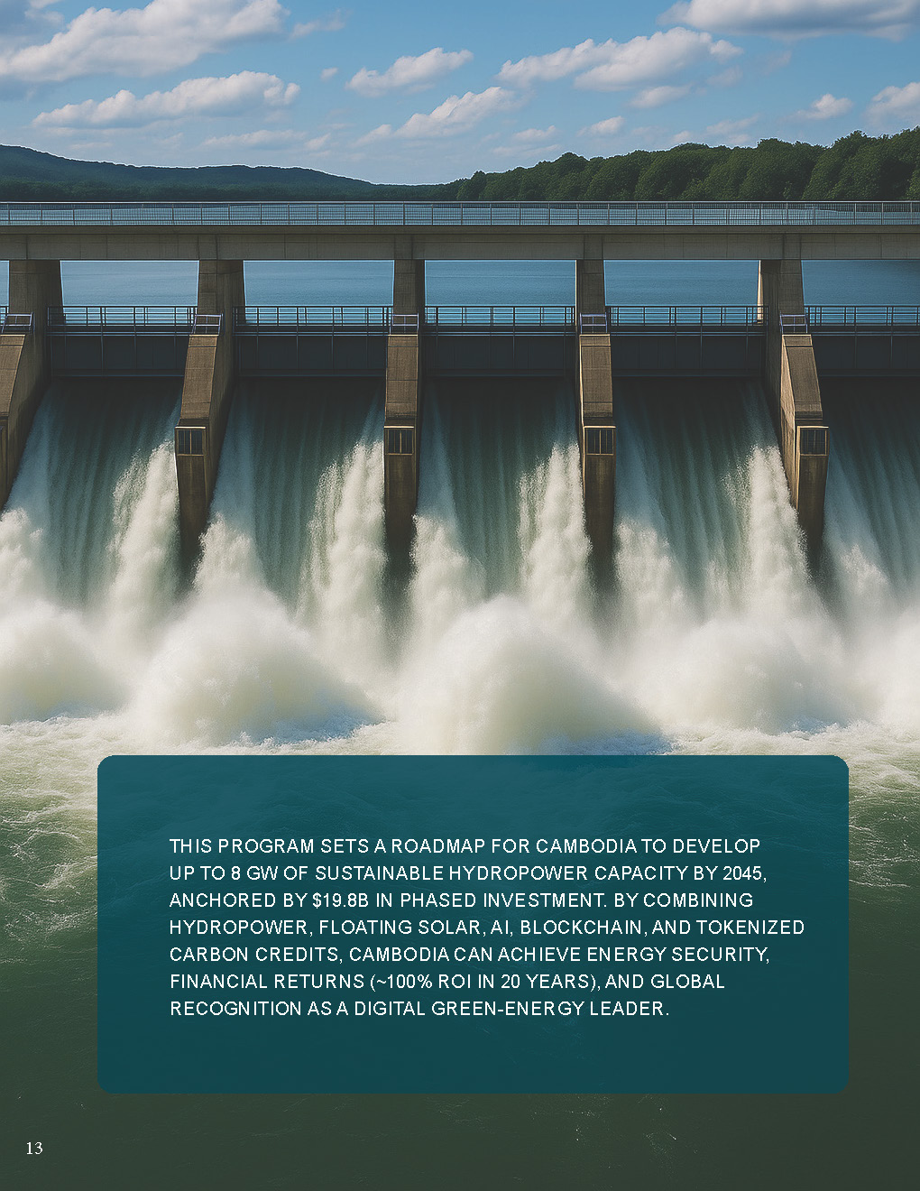 This program sets a roadmap for Cambodia to develop up to 8 GW of sustainable hydropower capacity by 2045, anchored by $19.8B in phased investment. By combining hydropower, floating solar, AI, blockchain, and tokenized carbon credits, Cambodia can achieve energy security, financial returns (~100% ROI in 20 years), and global recognition as a digital green-energy leader.